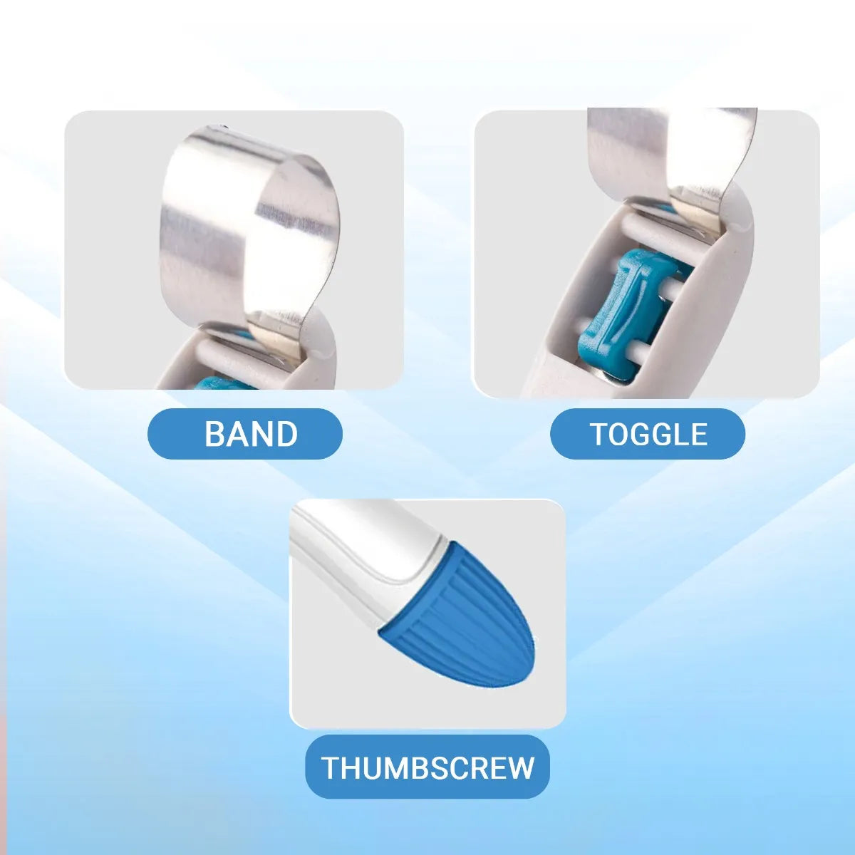 - Each band is pre-assembled in a plastic retainer with a tightening mechanism.