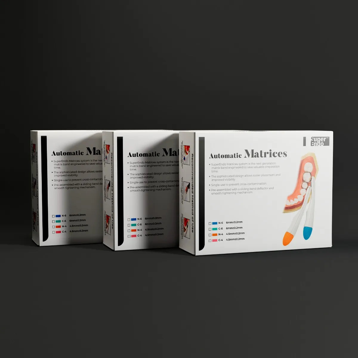 SuperEndo Automatic Matrices is a next generation matrix band, engineered to meet the evolving needs of dentistry. Single-use and pre-assembled, with a sliding band deflector and smooth tightening mechanism, making the circumferential band suitable for large and small restorations. It slides easily over the tooth, and the retainer handle is smooth against the patient’s cheek. A single-use solution for amalgam and composite restorations for use in all quadrants in every class. SuperEndo Automatic Matrix is fully disposable to comply with cross infection protocols and saves time and effort of assembling and sterilising.