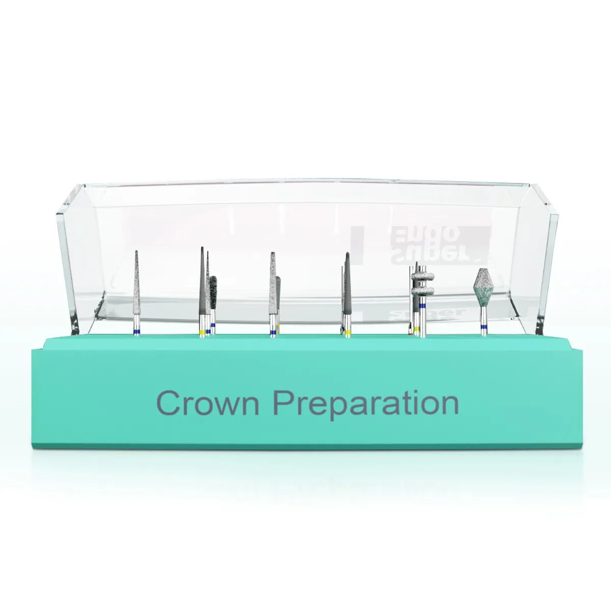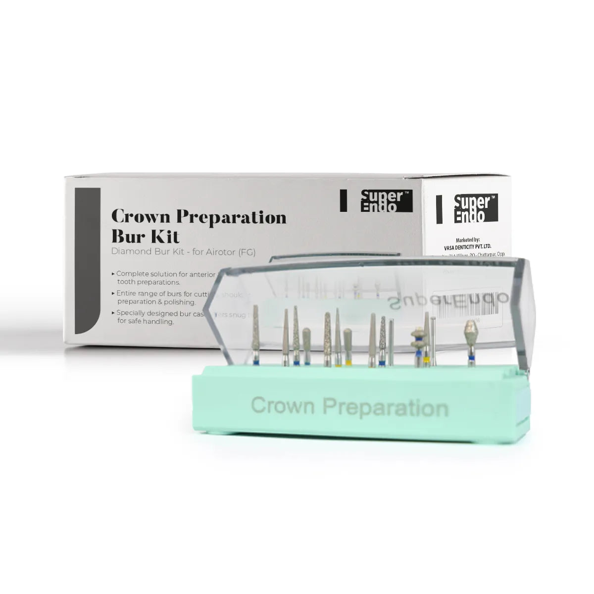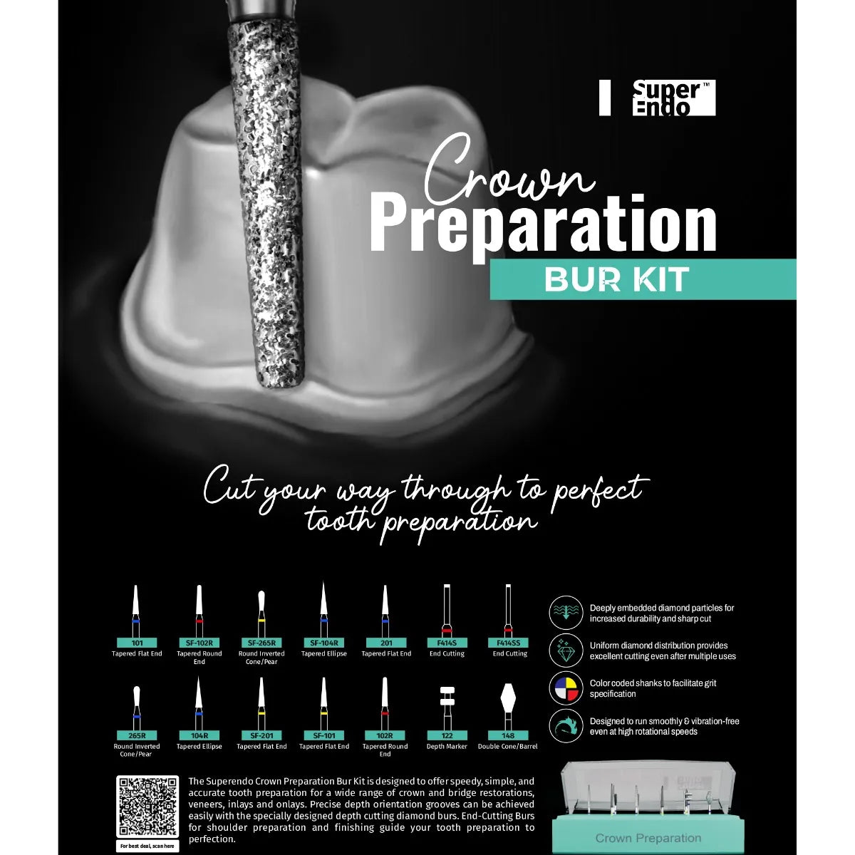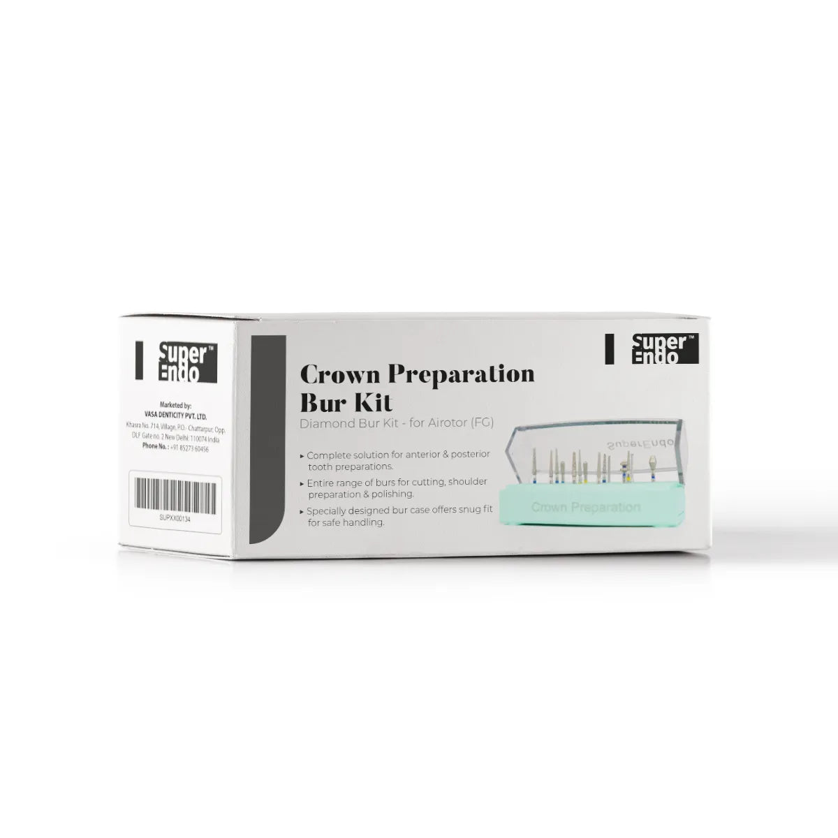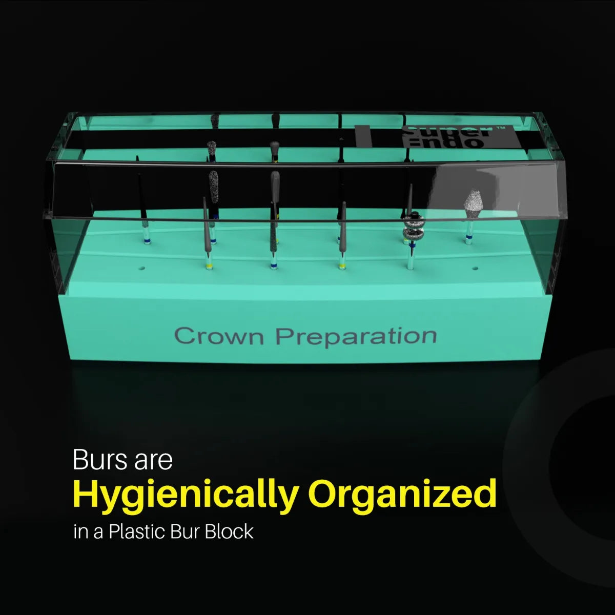 Answer: The SuperEndo Crown Preparation Bur Kit features high-quality diamond burs with silicon inside, providing a secure grip on the burs. The burs are organized in a hygienic plastic bur block.