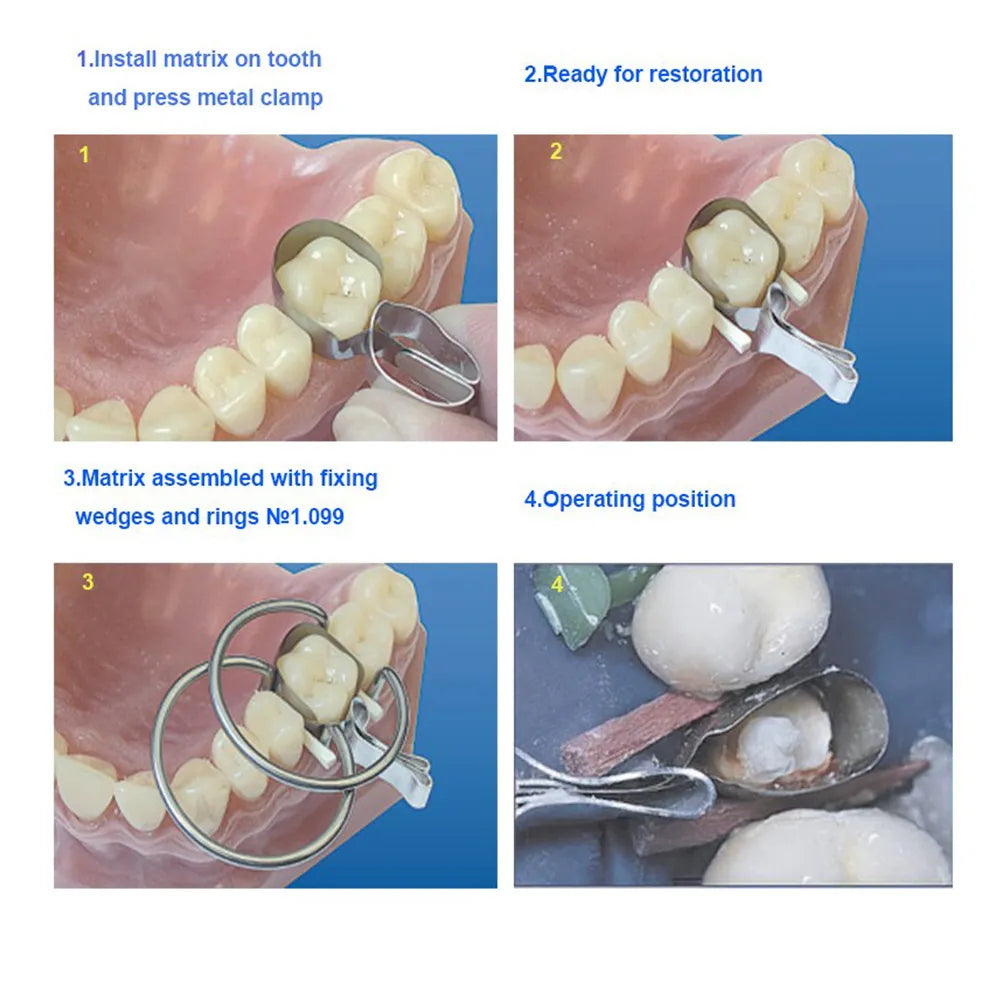 Tor Vm Contoured Metal Matrices are thin sheets of metal that are shaped to fit a specific tooth or teeth in restoration procedures. These matrices are typically made of stainless steel and are used to create a temporary wall around a tooth or teeth that have been prepared for a restoration, such as a filling or a crown.The contoured metal matrix is placed around the tooth and shaped to the natural contour of the tooth, which helps to create a tight seal between the tooth and the matrix. This seal helps to keep the restorative material in place while it is being placed and shaped, and helps to prevent any excess material from getting into other areas of the mouth. Contoured metal matrices are an important tool in modern dental restorative procedures, as they allow for more precise and efficient restorations. They also help to reduce the amount of time that a patient needs to spend in the dental chair, as they allow the dentist to work more quickly and accurately.