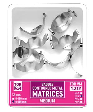 Tor Vm Saddle Contoured Metal Matrices are used to restore the shape and contour of a tooth. They are thin, flexible metal strips that are contoured to fit the shape of the tooth and create a temporary wall to hold restorative materials in place while they set.