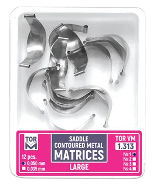 Tor Vm Saddle Contoured Metal Matrices are used to restore the shape and contour of a tooth. They are thin, flexible metal strips that are contoured to fit the shape of the tooth and create a temporary wall to hold restorative materials in place while they set.