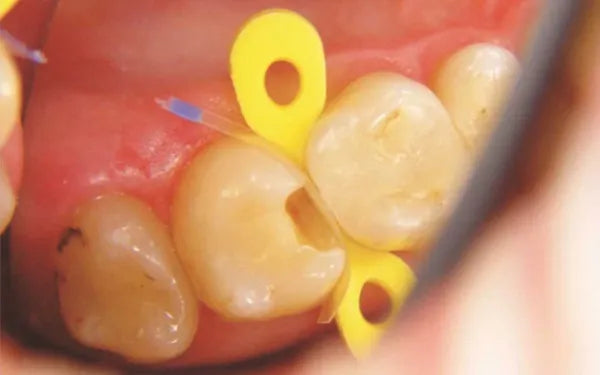 - Insert the transparent contoured matrix, making sure it sits flush against the tooth and extends slightly beyond the gingival margin.