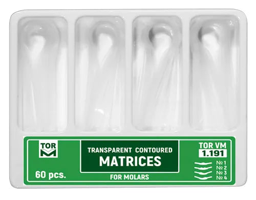 - Transparent contoured matrices are in four shapes of premolar matrices and four shapes of molar matrices