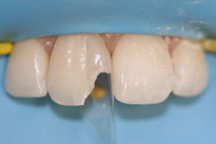- Next, Place a transparent strip over the restoration and carefully press it into place.