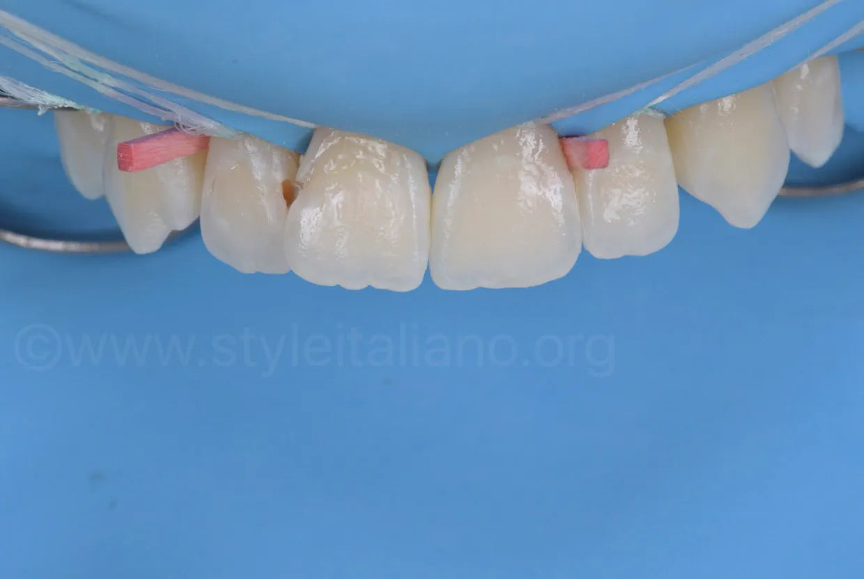 - Insert the wedge: Holding the wedge with a pair of tweezers or a wedge holder, insert it into the space between the teeth, with the thin end pointing towards the gum line. Apply gentle pressure to insert the wedge completely.