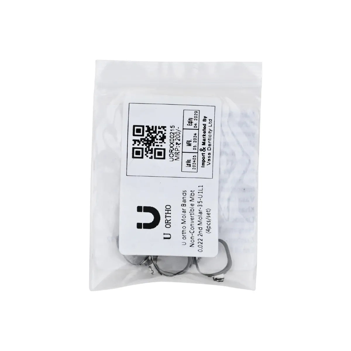 The U Ortho Molar Bands Non-Convertible MBT 0.022 for 2nd molars come in a convenient pack of 4, designed specifically for orthodontic applications. Made from high-quality stainless steel, these bands provide excellent durability and resistance to wear.