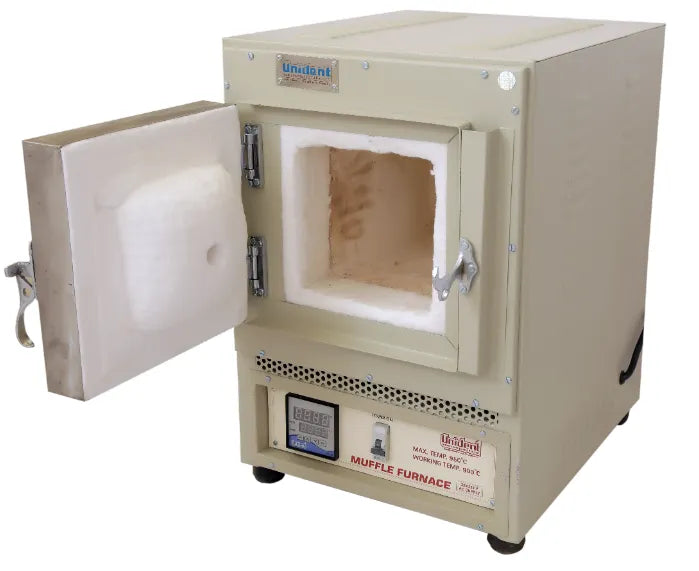 Unident Dental Rectangular Muffle Furnace are light weight with ceramic fiber wool insulation. The outer case is made of double walled thick P.C.R.C. sheet.Heating Elements are made of Kanthal wire backed by cerwool insulation. A viewing cap is also provided on the door. Temperature control unit consists of Energy Regulator and Digital Display with silver thermal fuse or with Digital Controller cum Indicator to work on 220/230 volts AC with an accuracy of + / – 3′ C better.