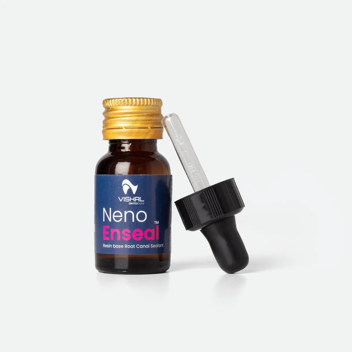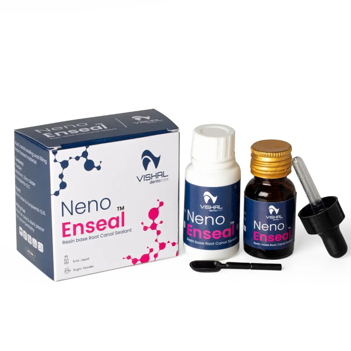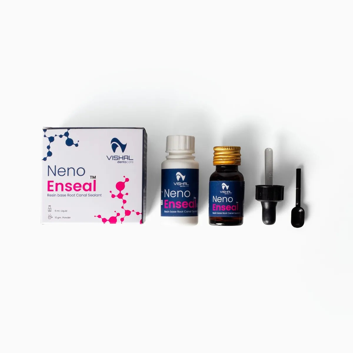 ENSEAL NENO is an endodontic filling material with anti-bacterial activity. It offers the advantage of anti-bacterial activity of Iodoform and strength of calcium Hydroxide and Barium Sulphate. It is available in two packs, one pack contains powder 10 mg. which includes Iodoform, calcium hydroxide, zinc oxide and barium sulphate. The second pack contains liquid which includes oil of clove and Canada balsam.