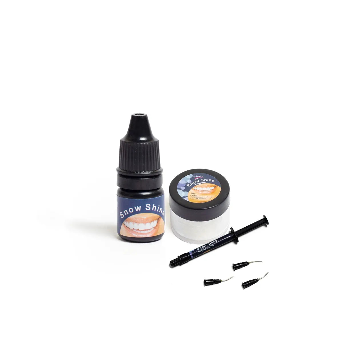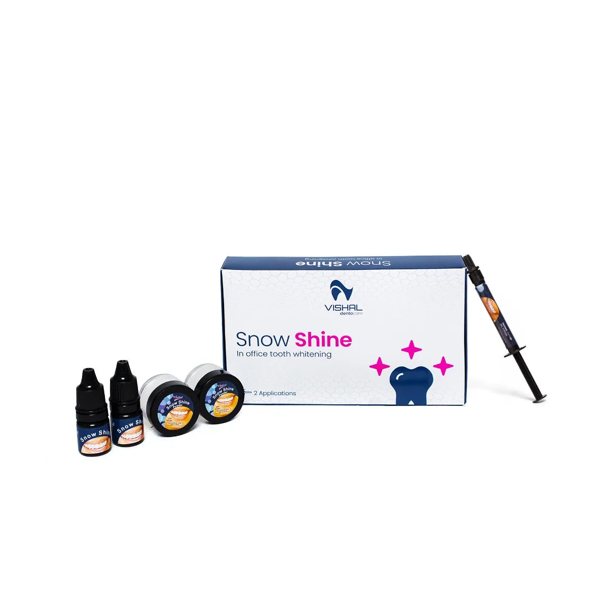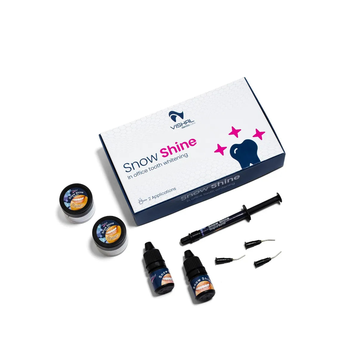 Answer: Vishal Dentocare Snow Shine is an in-office tooth bleaching and whitening system that uses a 35% Hydrogen Peroxide gel with an inbuilt desensitizer to efficiently whiten teeth with minimal chair time.