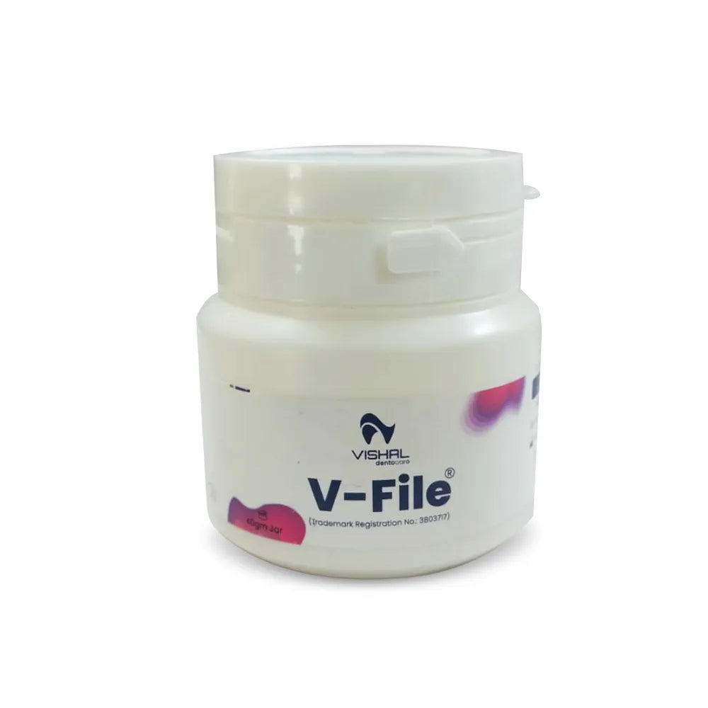 V - File Cream is an effective EDTA, water soluble, Viscous cream for chelating, lubricating, debrising and preparations of root canal. EDTA is bio - friendly material and helps bio - mechanical process by chelating with dentin. Stable formulation will not dry or thicken. Consistency is adjusted, which is easy to dispense and take in the canal with instrument.