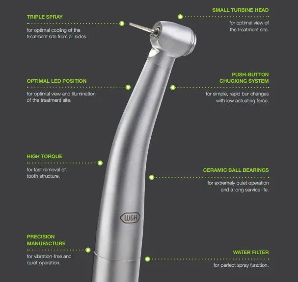 W&H TE Airotor Handpiece offer top quality due to their precision manufacture. Ceramic ball bearings in W&H TE Airotor Handpiece guarantee vibration-free and quiet operation. And ensure an extremely long service life. Particularly when used with optimized care and maintenance procedures.