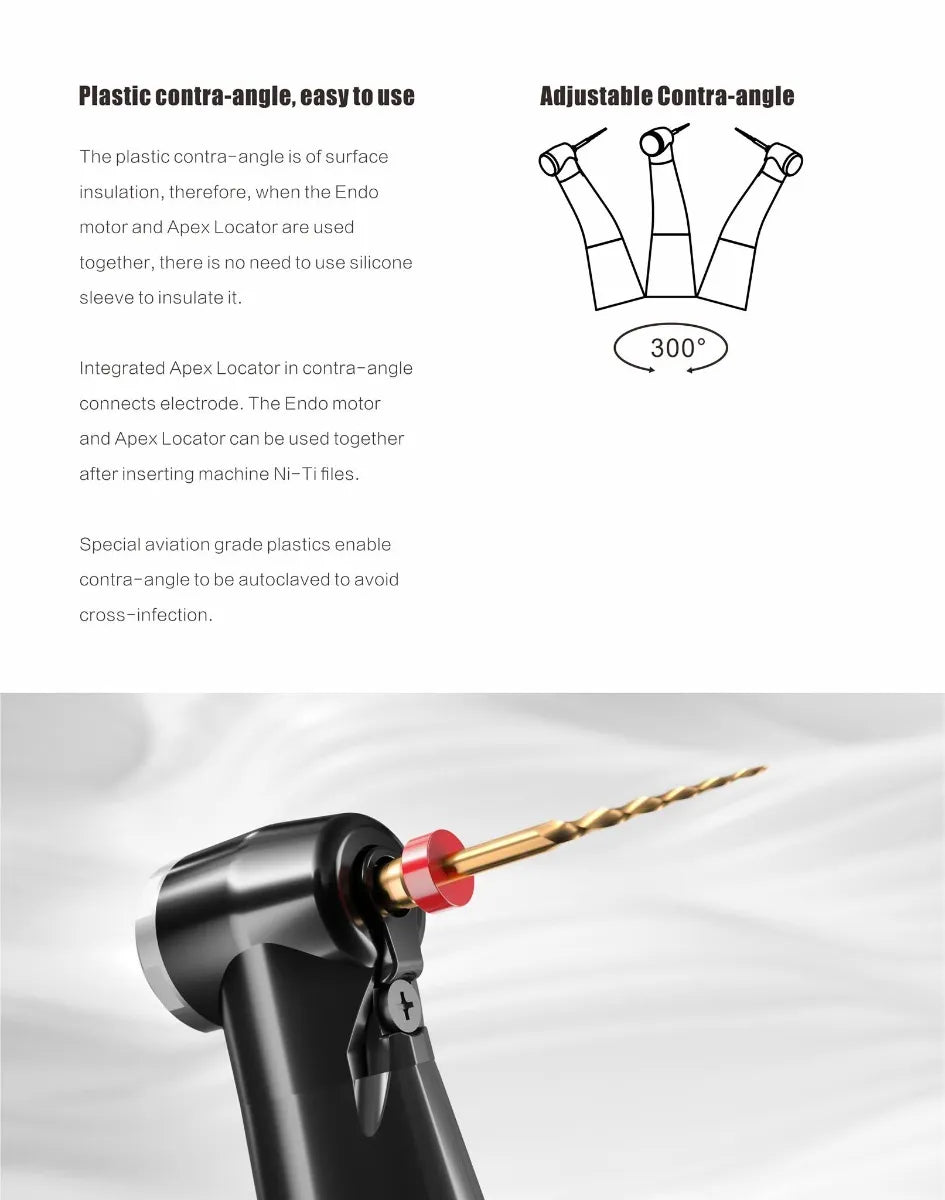 canal measurement, easy to use. - 300 degrees rotation of contra-angle.