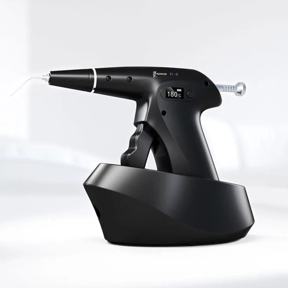 The Woodpecker Obturation Gun is an advanced dental device specifically designed to simplify and enhance the process of root canal filling. This innovative tool replaces traditional methods with its exceptional quality control system and user-friendly features, ensuring safe and reliable operation. Equipped with a range of components, the Woodpecker Obturation Gun offers efficient and effective root canal treatment. Its key features include a gutta-percha injection needle, heat insulation sleeve, heat insulation hood, gutta-percha loading slot, battery level indicator, temperature controls, "ON/OFF" button, pushing ram, and charging base. Each component is meticulously designed and integrated to provide a seamless user experience.