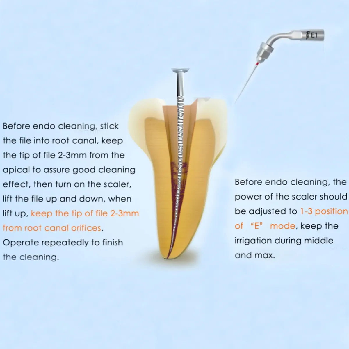 - Use the scaler tip to gently clean and irrigate the root canal. Focus on thorough cleaning of the root canal system, ensuring effective irrigation to remove debris