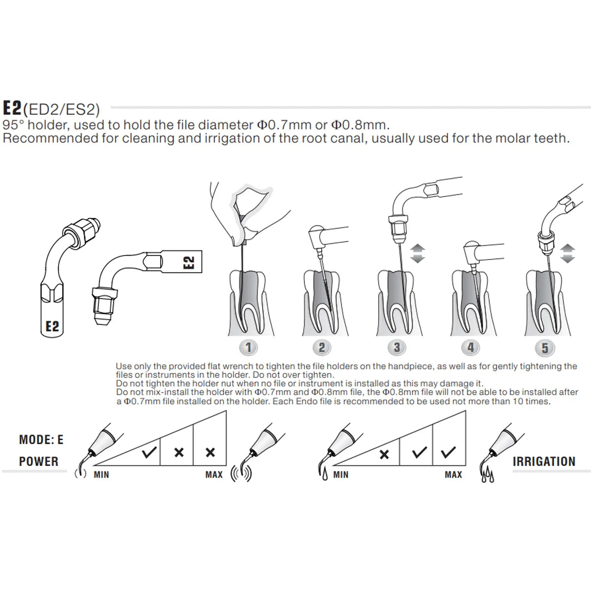 - Use only the provided flat wrench to tighten the file holders on the handpiece, and gently tighten the files or instruments in the holder. Avoid over-tightening, and do not tighten the holder nut when no file or instrument is installed to prevent damage