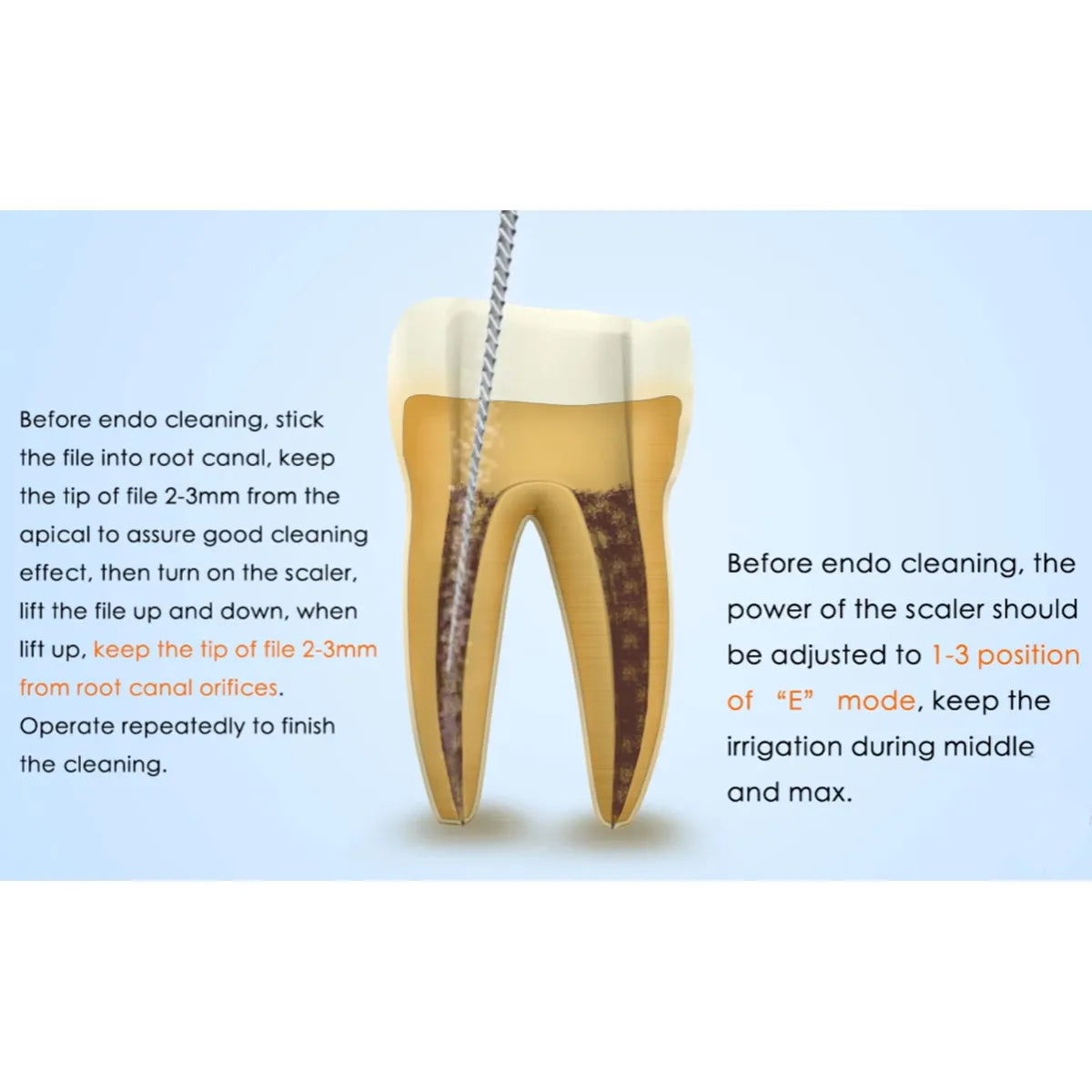 - Gently insert the scaler tip into the molar root canal. Use a light, sweeping motion to clean and irrigate the canal system thoroughly. Focus on removing debris and ensuring effective irrigation