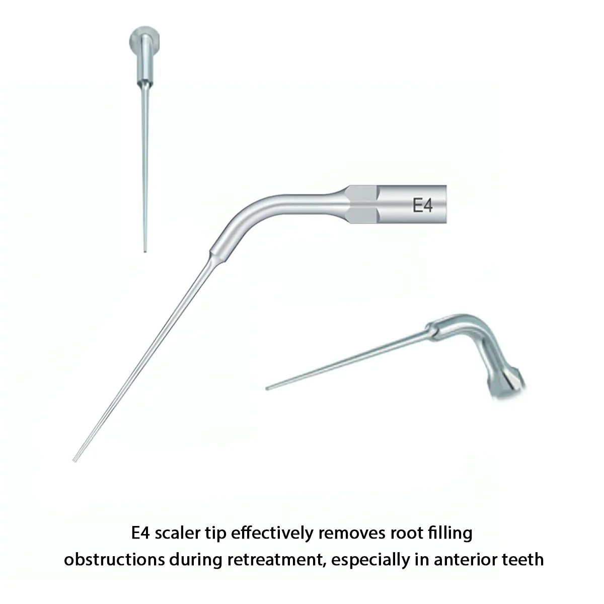Answer: E4 scaler tip is designed for removing root-filling obstructions and foreign bodies during root canal retreatment, which particularly effective for anterior teeth