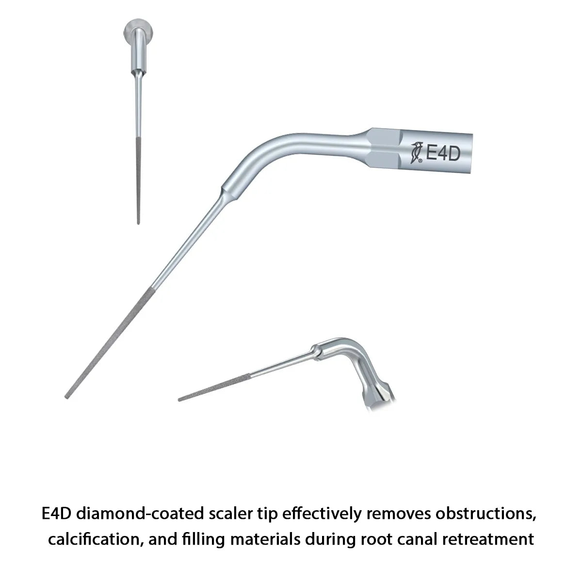 - Insertion: Gently insert the diamond-coated E4D scaler tip into the root canal where the obstruction, calcification, or filling material is located