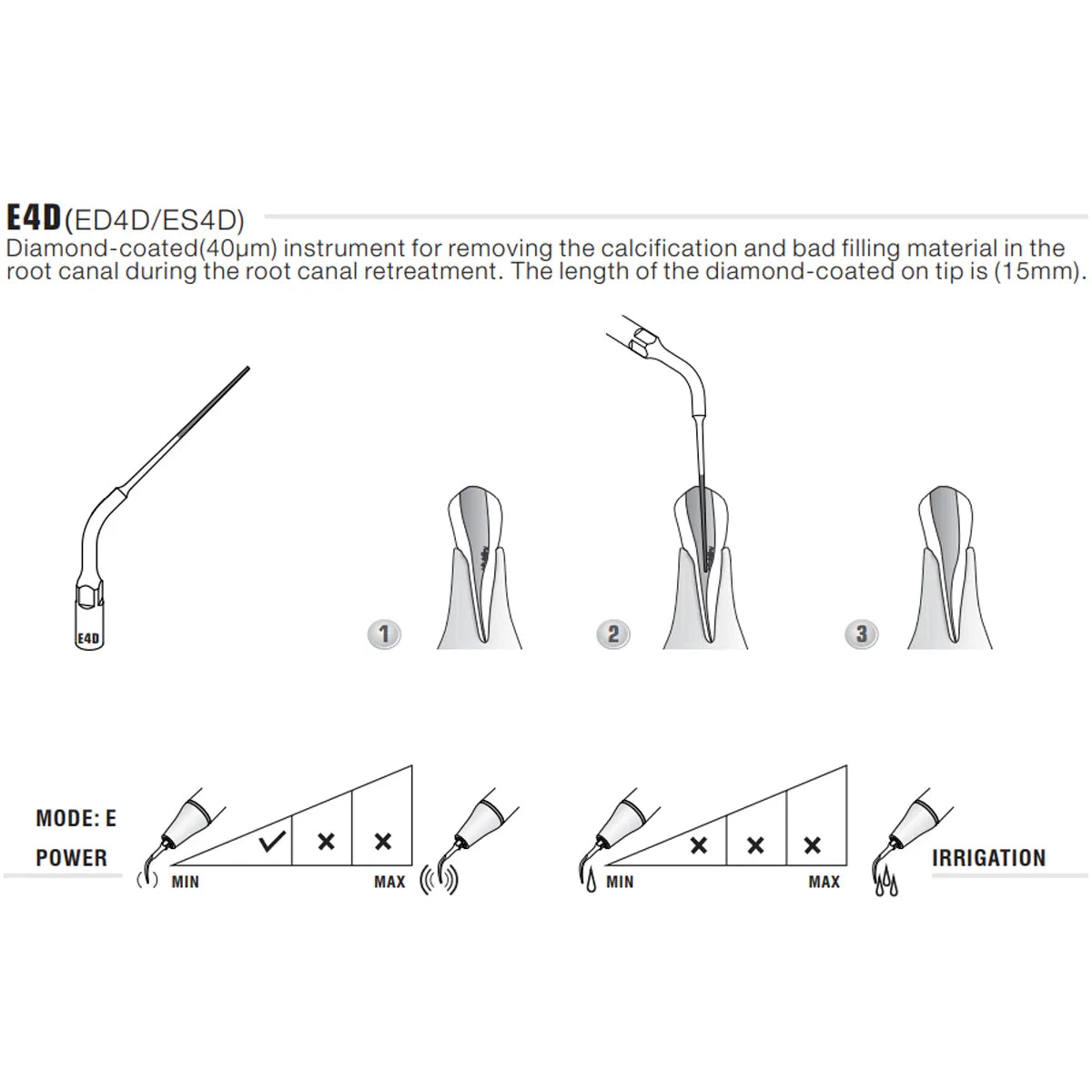 - Maneuverability: The 15mm length of the E4D tip allows access to the upper portion of the root canal, facilitating thorough cleaning