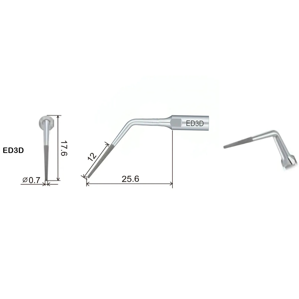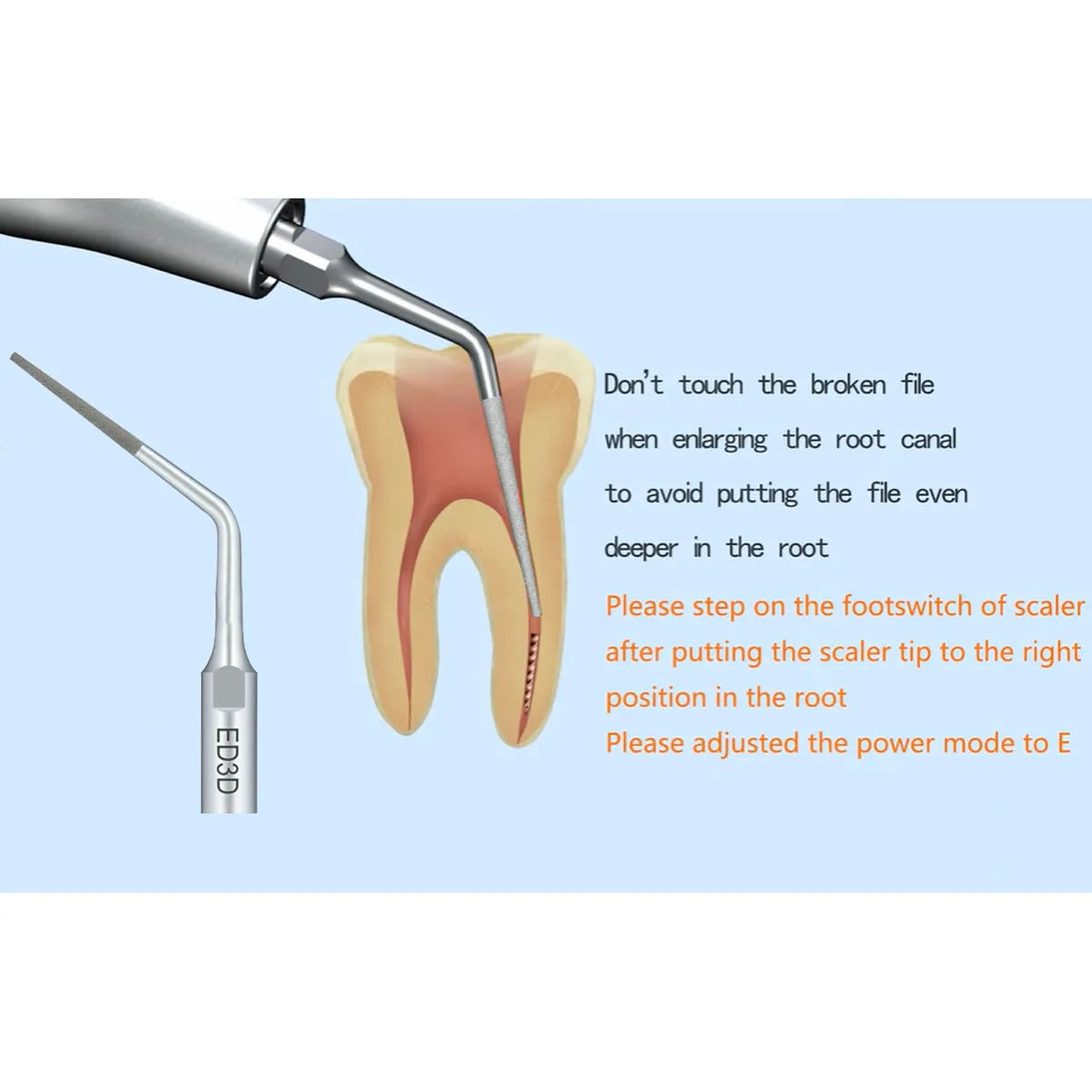 Woodpecker Scaler Tip ED3D for DTE & Satelec Scalers is a specialized instrument designed for the effective removal of calcification and defective filling material from the pulp cavity and chamber during endodontic procedures. This diamond-coated tip is particularly useful for enlarging root canals and accessing broken files within the canal space. Its unique design allows for precise and controlled removal of obstructions, facilitating successful root canal treatment. The ED3D tip is compatible with DTE & Satelec ultrasonic scalers, ensuring seamless integration into existing dental setups. It is essential for endodontists and general practitioners alike, as it enables them to effectively manage challenging cases involving calcified canals or broken instruments. By using the ED3D tip, dentists can enhance the success rate of root canal treatments and provide optimal care to their patients.