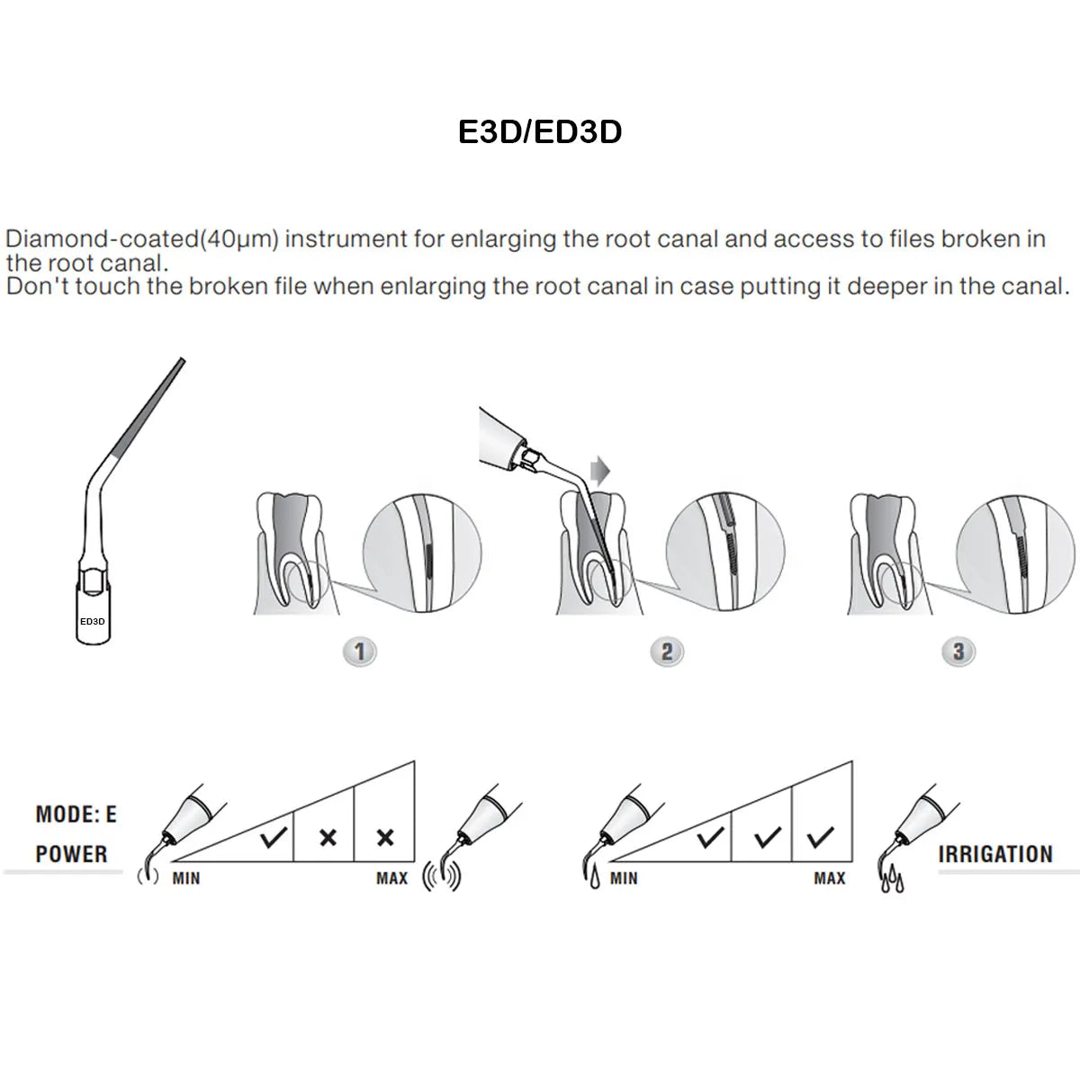 Answer: ED3D scaler tip is designed for removing calcification and defective filling materials from the pulp cavity and chamber during endodontic procedures.
