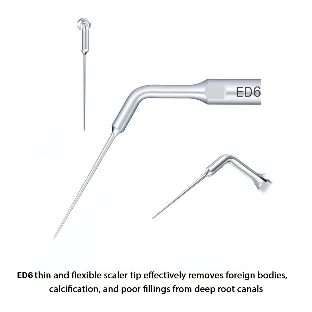 Woodpecker Scaler Tip ED6 for DTE & Satelec Scalers is a specialized dental instrument designed for removing foreign bodies from deep root canals. Its thin and flexible design allows for easy navigation within challenging canal spaces, making it ideal for accessing hard-to-reach areas. Constructed from high-quality stainless steel, this tip ensures durability and reliability during procedures. The ED6 scaler tip is particularly effective in eliminating calcification and poor filling materials, as well as addressing pulp chamber overhangs. Its versatility makes it an essential tool for dental professionals performing endodontic treatments. Compatible with DTE & Satelec scalers, the ED6 tip enhances the efficiency and effectiveness of root canal procedures, contributing to improved patient outcomes.