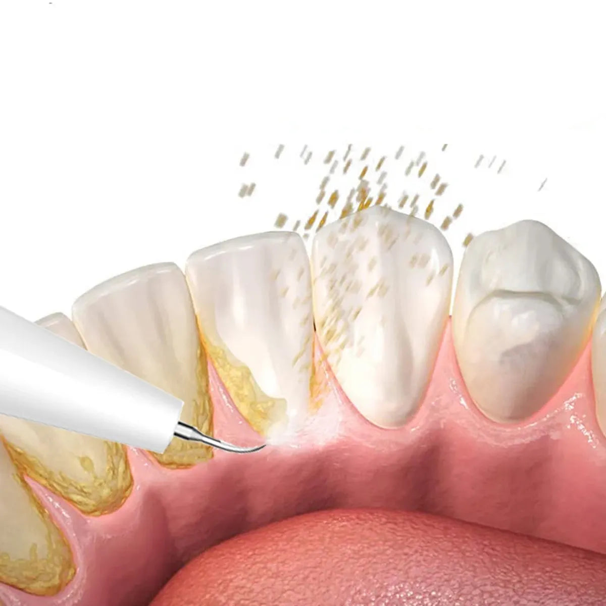 - Use the scaler tip to apply light pressure against the tooth surfaces, focusing on supragingival calculus and plaque in all quadrants. Glide the tip gently along the surfaces, including interproximal and sulcus areas