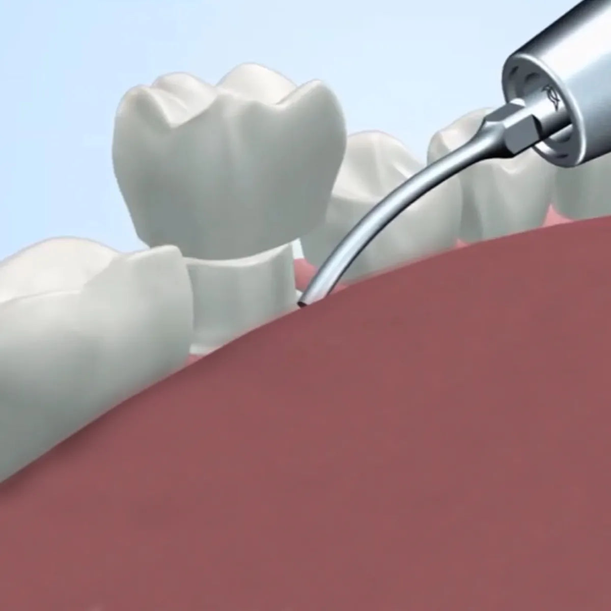 - Use the scaler tip to apply light pressure against the tooth surfaces, focusing on the removal of crowns, pins, and inlays. Glide the tip gently along the surfaces, ensuring to cover all areas.