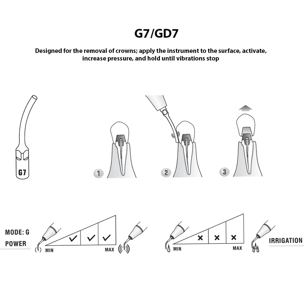 Answer: The GD7 tip is designed for the efficient removal of dental crowns using ultrasonic vibrations.